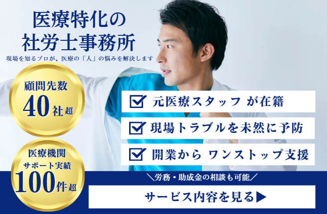 他にも、労務相談顧問、社会保険手続き代行顧問、給与計算アウトソーシング、就業規則の作成・見直し、助成金申請代行、研修の実施、労務監査・改善顧問、クリニック開業支援等の対応も可能ですので、労務関係でお困りの方はお気軽にご相談ください。
